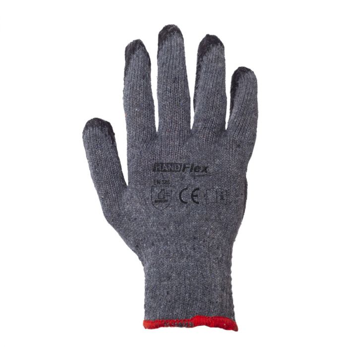 Rękawice ochronne wykonane z dzianiny, powlekane w części chwytnej czarną, szorstką gumą. Zakończone ściągaczem.
